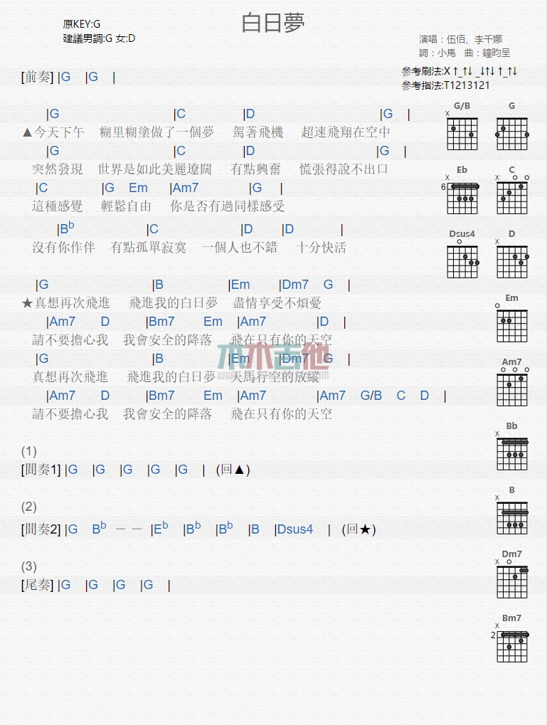曲谱介绍: 伍佰,李千娜《白日梦》吉他弹唱谱,共有1张高清图谱,免翻页排版设计。