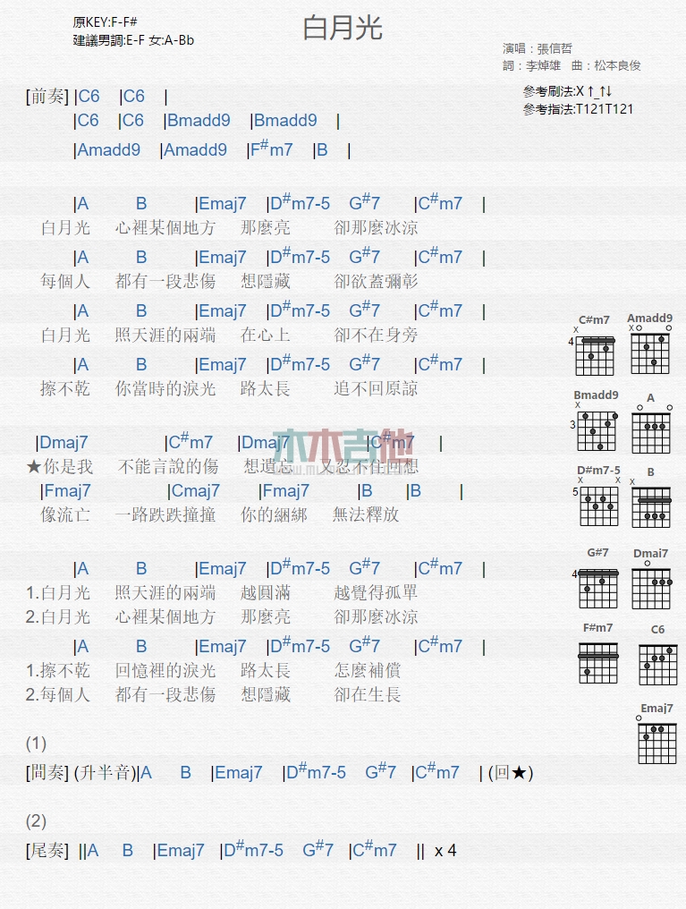 曲谱介绍: 张信哲《白月光》吉他弹唱谱,共有1张高清图谱,免翻页排版设计。