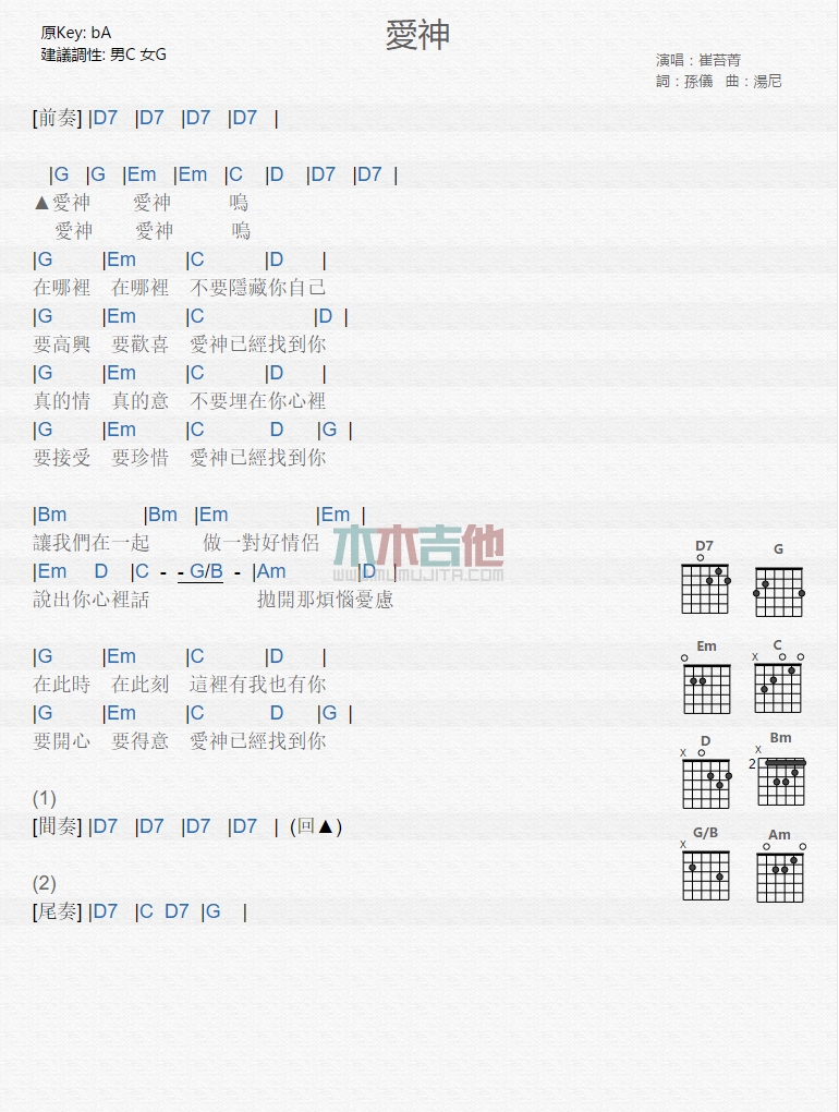 曲谱介绍: 崔苔菁《爱神》吉他弹唱谱,共有1张高清图谱,免翻页排版设计。