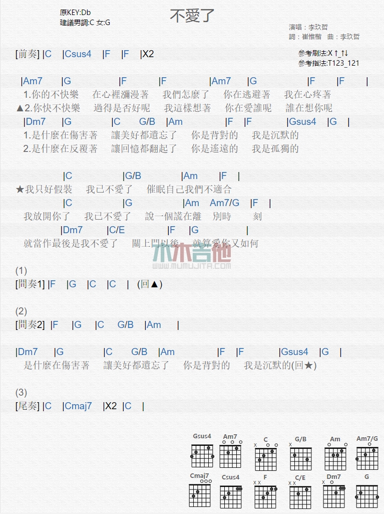 不爱了吉他谱 - 李玖哲 - 吉他弹唱谱