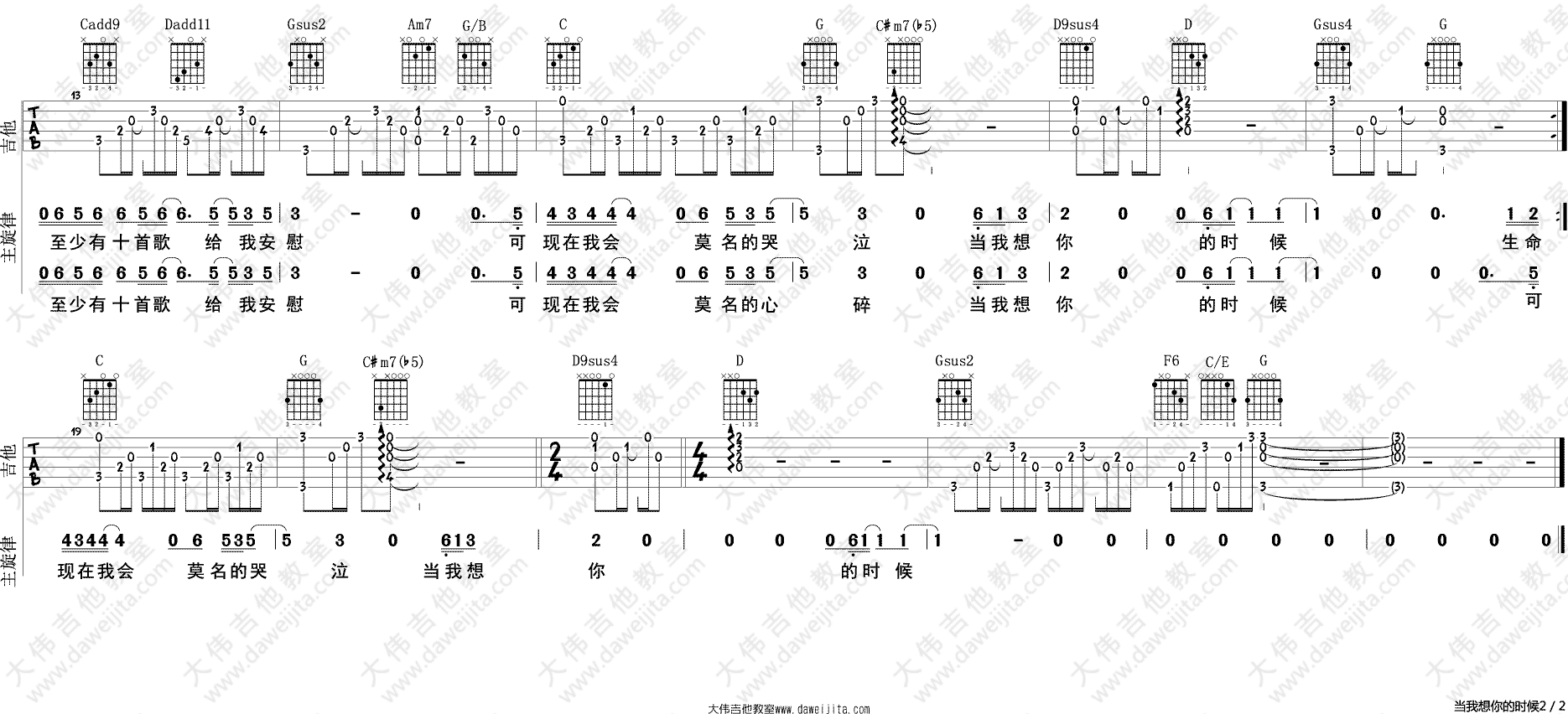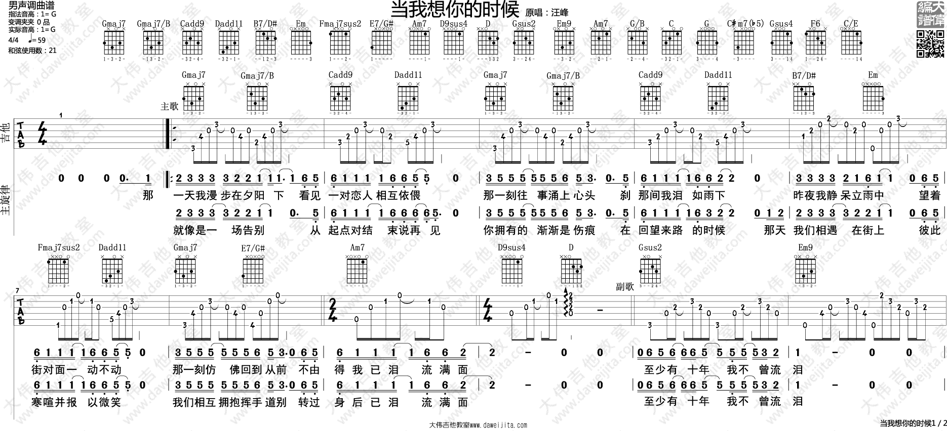 曲谱介绍: 汪峰《当我想你的时候》吉他弹唱谱,采用G调指法编配,共有2张高清图谱,免翻页排版设计。