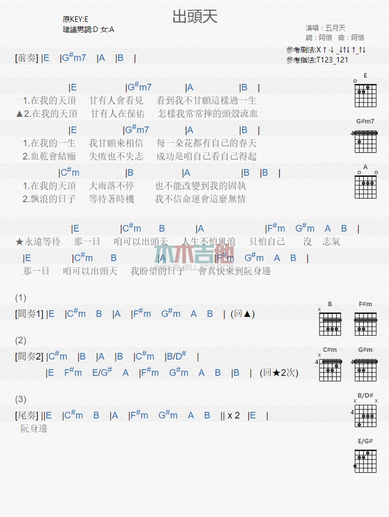 曲谱介绍: 五月天《出头天》吉他弹唱谱,共有1张高清图谱,免翻页排版设计。