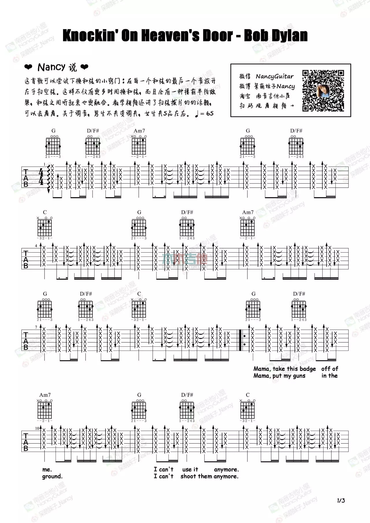 曲谱介绍: Bob,Dylan《KnockinonHeavensDoor》吉他弹唱谱,共有3张高清图谱。