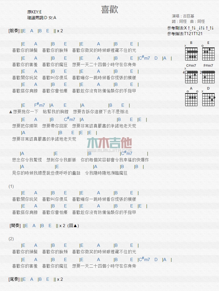 曲谱介绍: 古巨基《喜欢》吉他弹唱谱,共有1张高清图谱,免翻页排版设计。
