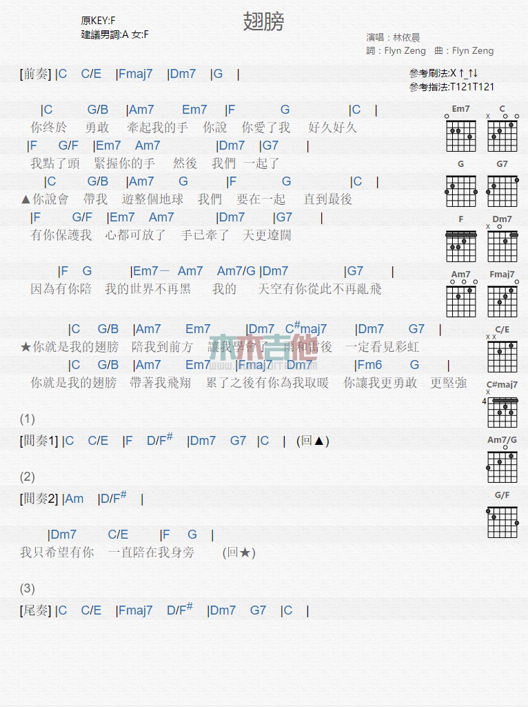 曲谱介绍: 林依晨《翅膀》吉他弹唱谱,共有1张高清图谱,免翻页排版设计。