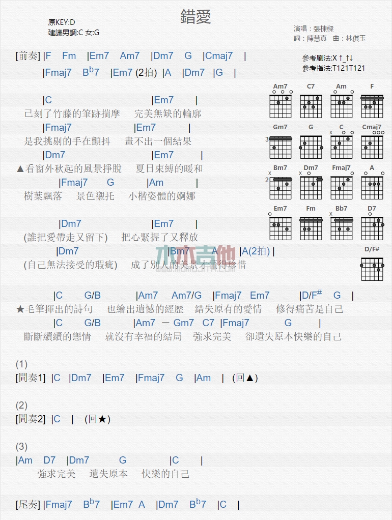曲谱介绍: 张栋梁《错爱》吉他弹唱谱,共有1张高清图谱,免翻页排版设计。
