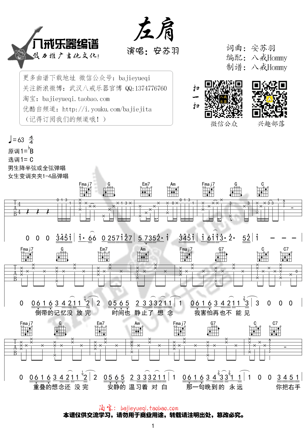 曲谱介绍: 安苏羽《左肩》吉他弹唱谱,共有4张高清图谱。