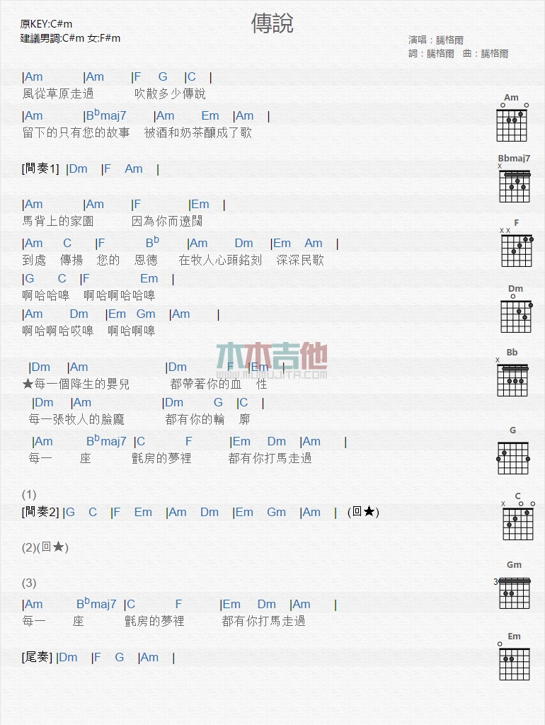 曲谱介绍: 腾格尔《传说》吉他弹唱谱,共有1张高清图谱,免翻页排版设计。