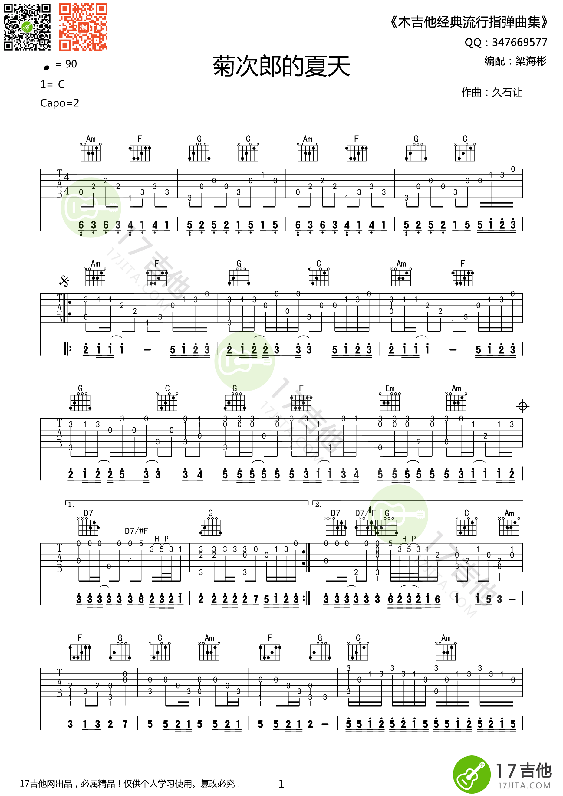 曲谱介绍: 名曲《Summer菊次郎的夏天》吉他独奏谱,共有2张高清图谱,免翻页排版设计。