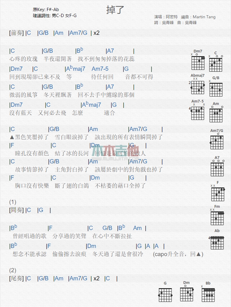 曲谱介绍: 张惠妹《掉了》吉他弹唱谱,共有1张高清图谱,免翻页排版设计。