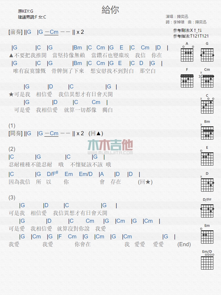 曲谱介绍: 陈奕迅《给你》吉他弹唱谱,共有1张高清图谱,免翻页排版设计。