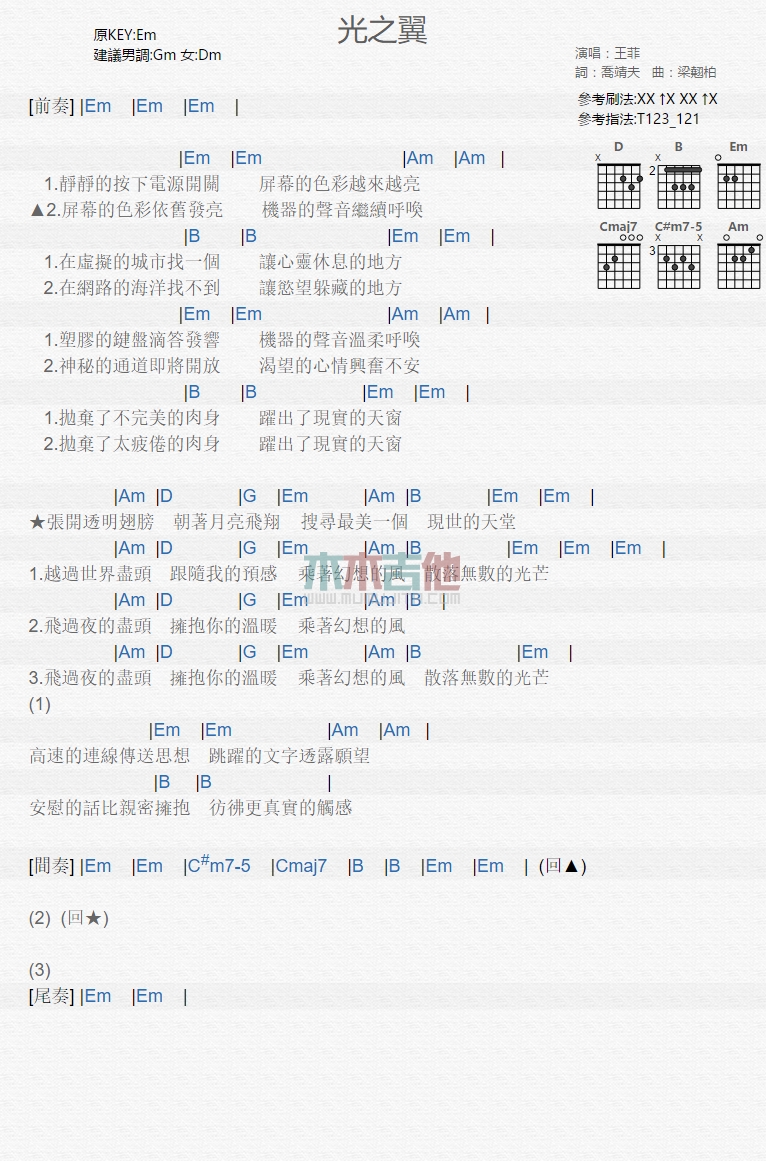 曲谱介绍: 王菲《光之翼》吉他弹唱谱,共有1张高清图谱,免翻页排版设计。