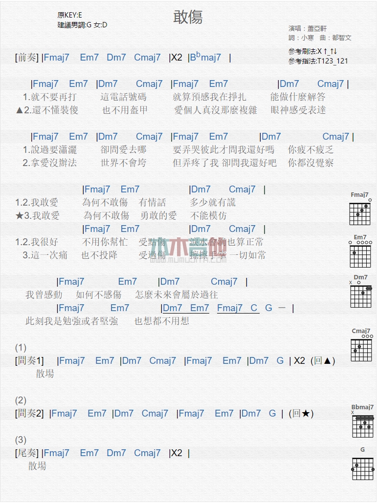 敢伤吉他谱 - 萧亚轩 - 吉他弹唱谱