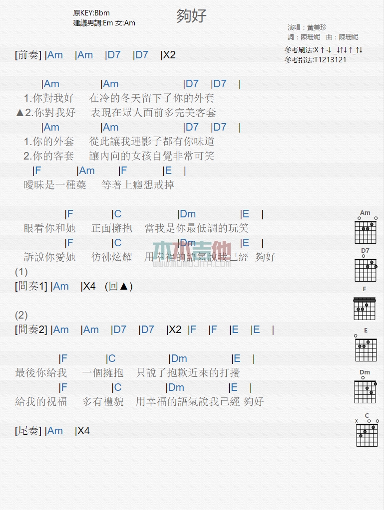 曲谱介绍: 黄美珍《够好》吉他弹唱谱,共有1张高清图谱,免翻页排版设计。