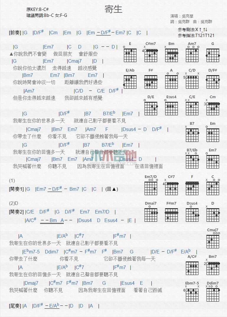 曲谱介绍: 吴克群《寄生》吉他弹唱谱,共有1张高清图谱,免翻页排版设计。