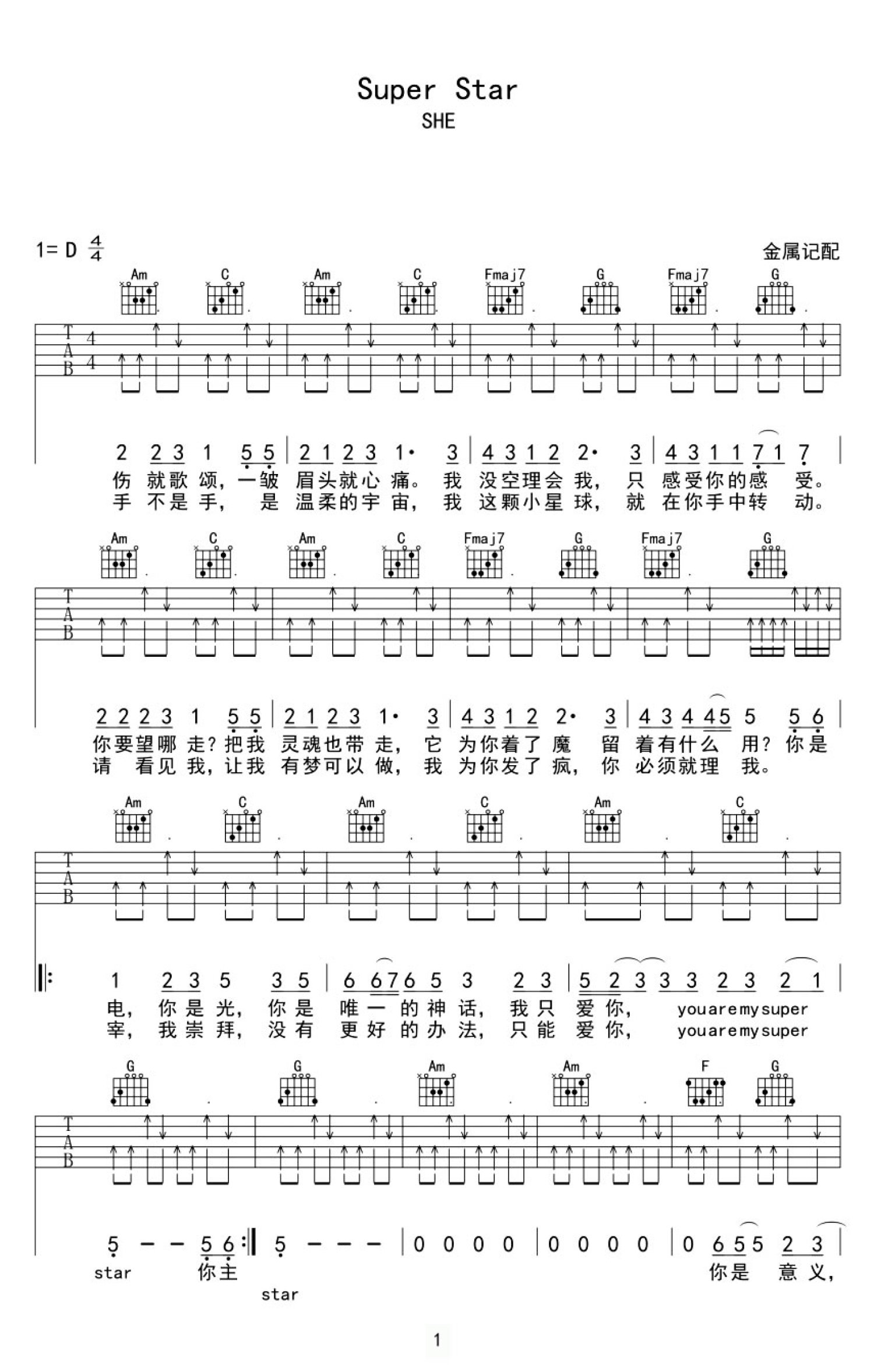 曲谱介绍: 台湾华语女子团体S.H.E演唱,是一首带有摇滚风格的动感歌曲,由施人诚填词,Jade、GeomanFromSweetbox谱曲。SuperStar吉他六线谱,图片谱格式高清版。再听到superstar,轻微忆起当时听歌的心情感悟,有种人长大了却将一些浅显的道理忘掉了,真该不忘初心,一直做涉世未深的少女又有何不可。