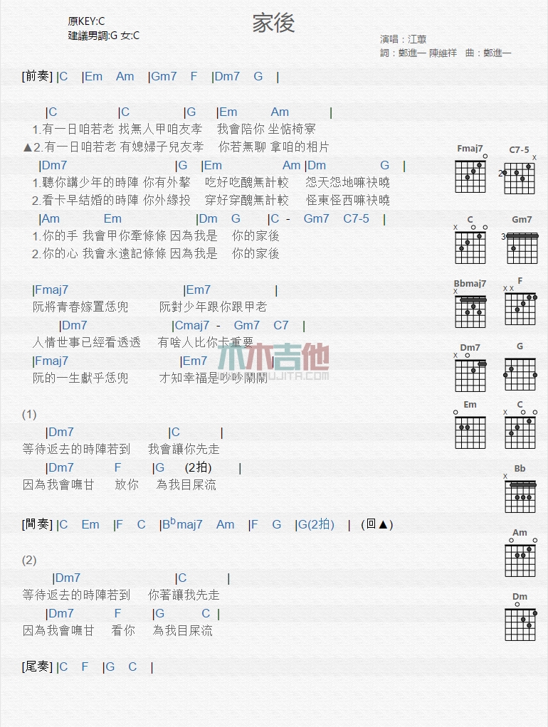 曲谱介绍: 江蕙《家后》吉他弹唱谱,共有1张高清图谱,免翻页排版设计。