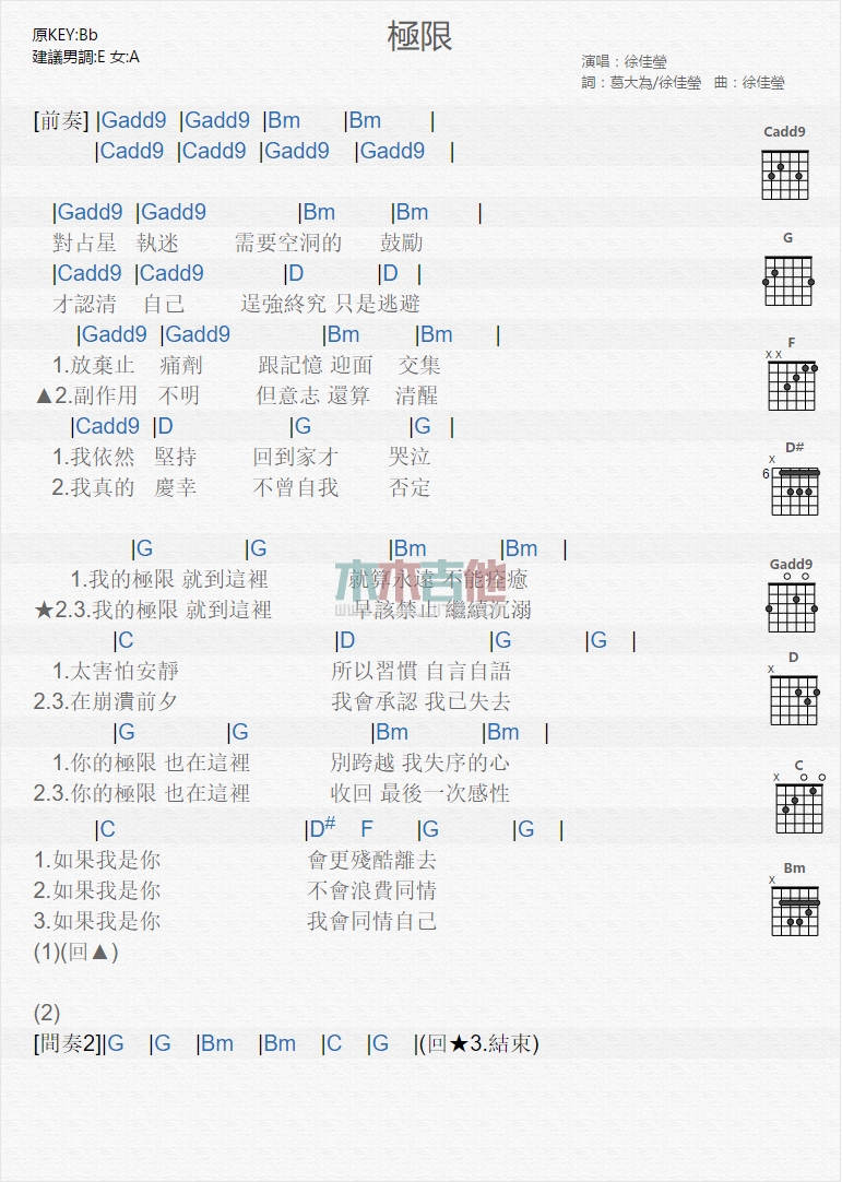 曲谱介绍: 徐佳莹《极限》吉他弹唱谱,共有1张高清图谱,免翻页排版设计。