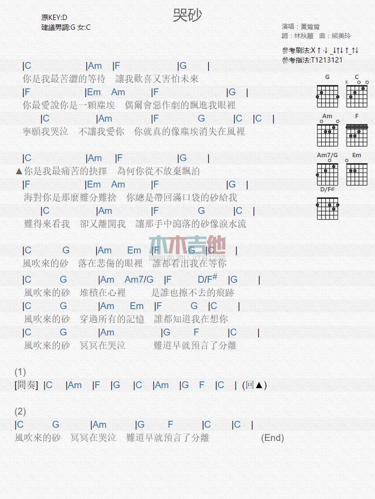 哭砂吉他谱 - 黄莺莺 - 吉他弹唱谱