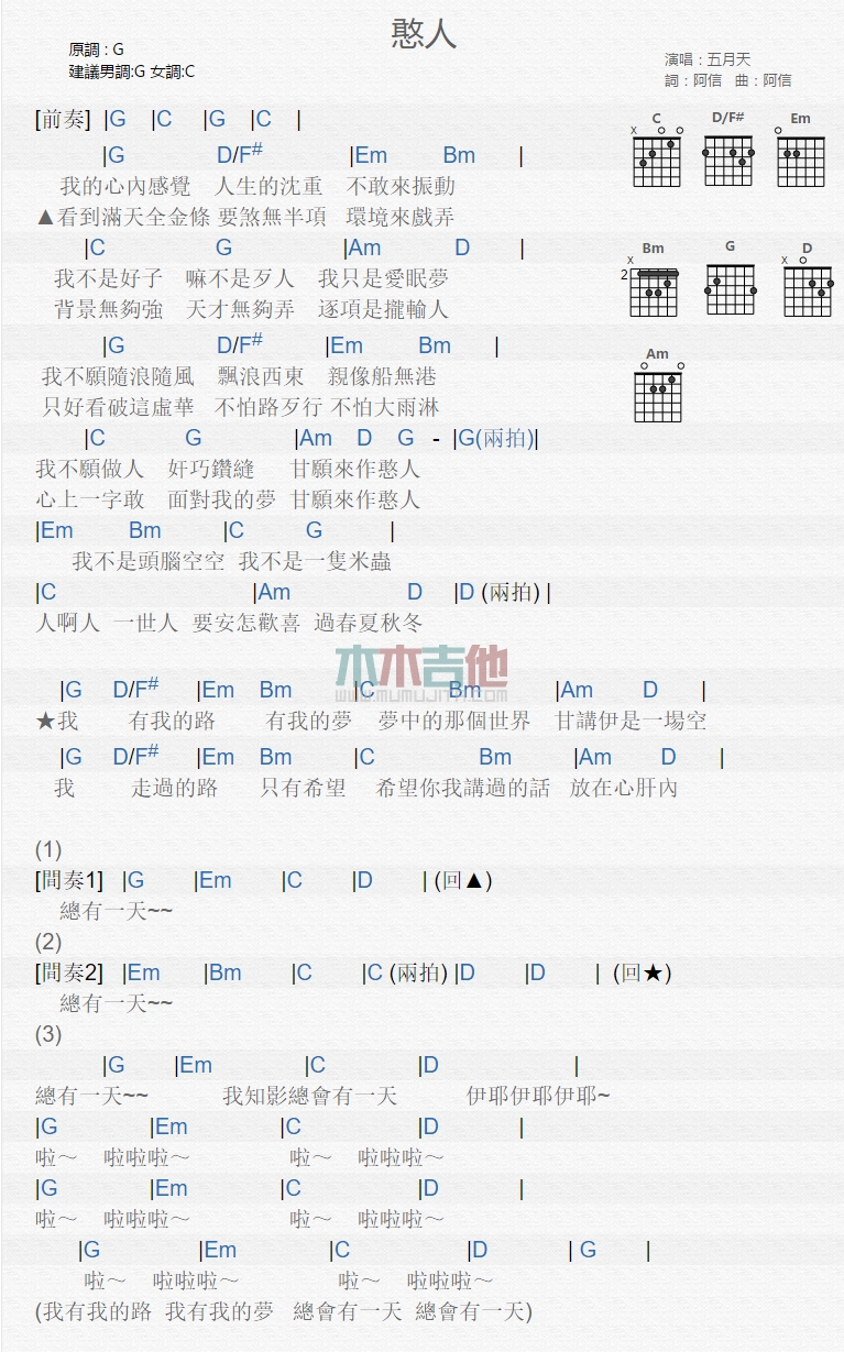 曲谱介绍: 五月天《憨人》吉他弹唱谱,共有1张高清图谱,免翻页排版设计。