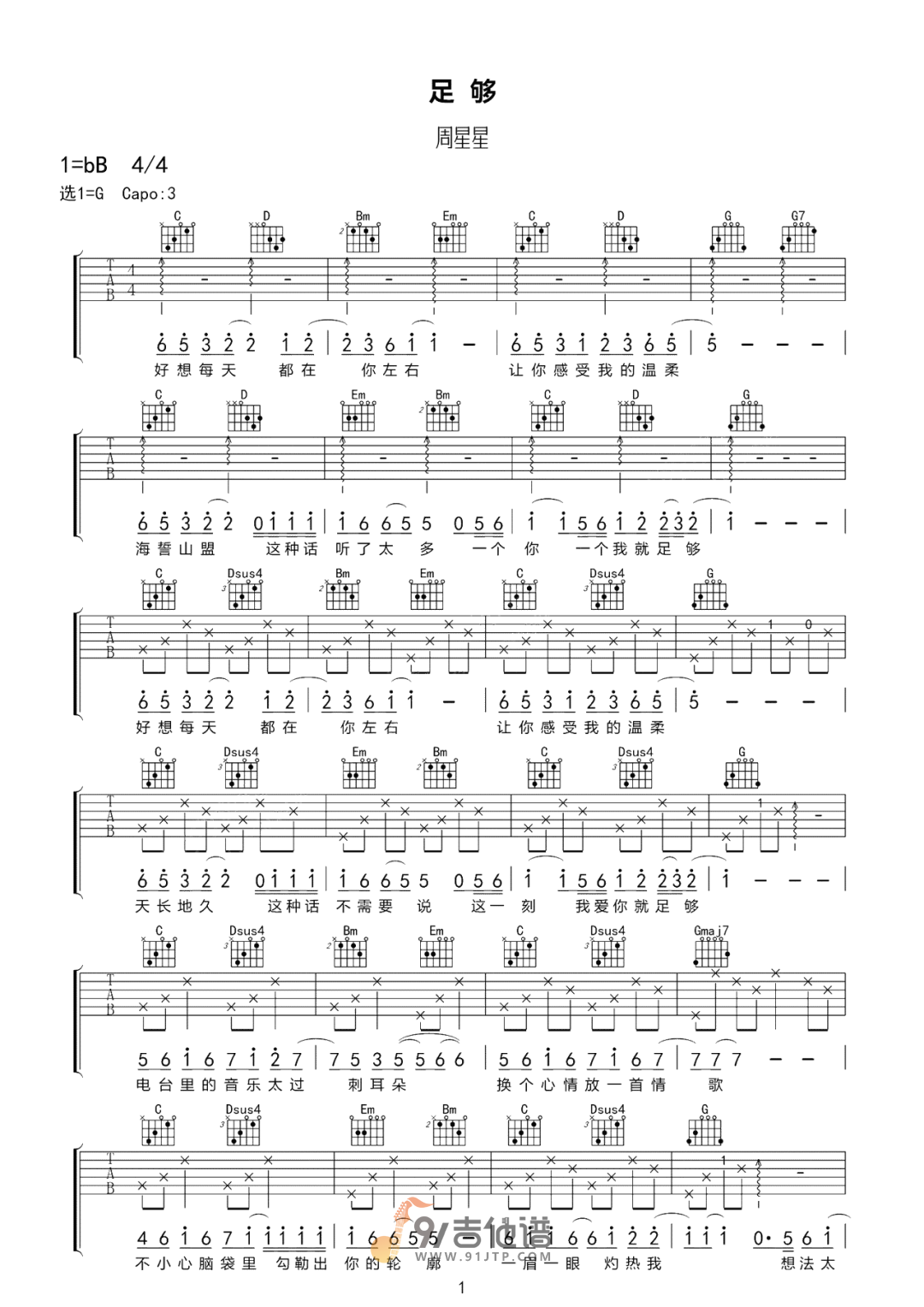 足够吉他谱 - 周星星 - G调吉他弹唱谱 - 原版