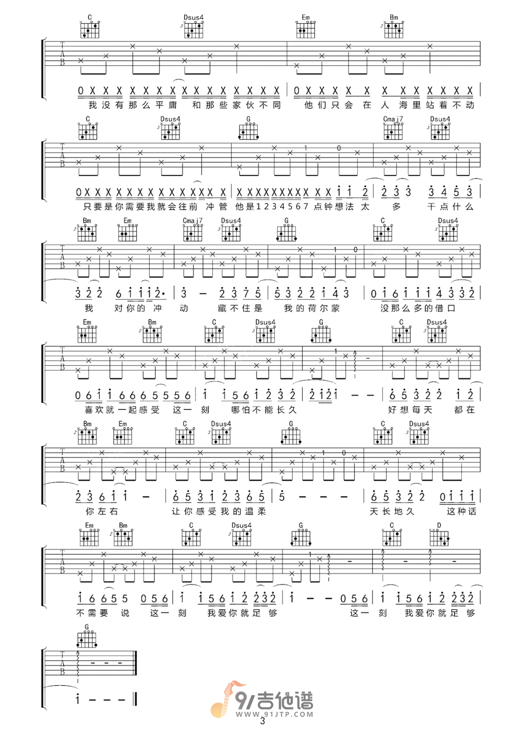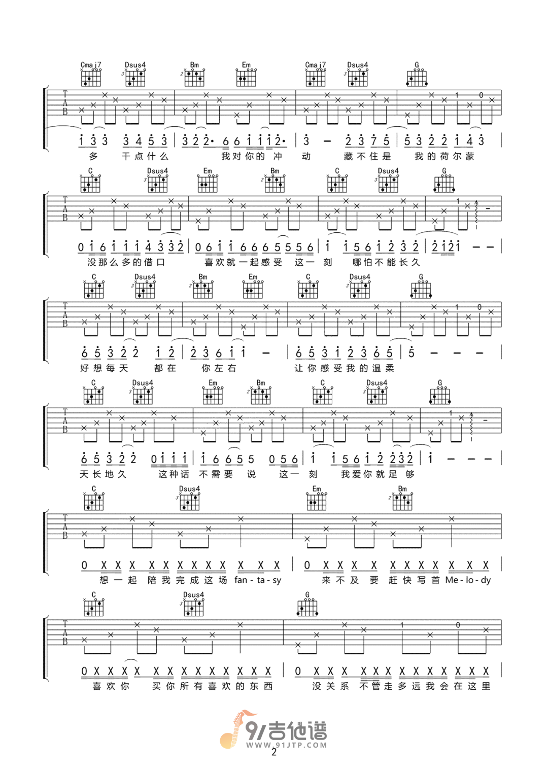 曲谱介绍: 曲谱简介:足够吉他谱,周星星演唱的一首歌曲,4/4拍的节奏,这首歌曲的原调为降B调,这里曲谱采用了G调指法进行编配,演唱时夹变调夹3品可回到原调,也可根据个人实际嗓音情况选择。曲谱由琴谱网更新上传,共3张高清图片弹唱吉他谱例,曲谱来源于网络转载,编配制谱者暂不详。一首非常适合在情人节听的歌,“好想每天都在你左右”,像是唱出了每对情侣的心声,真的很甜。歌曲唱的是一个人喜欢另一个人的心情,大概爱情就是这么的甜吧。