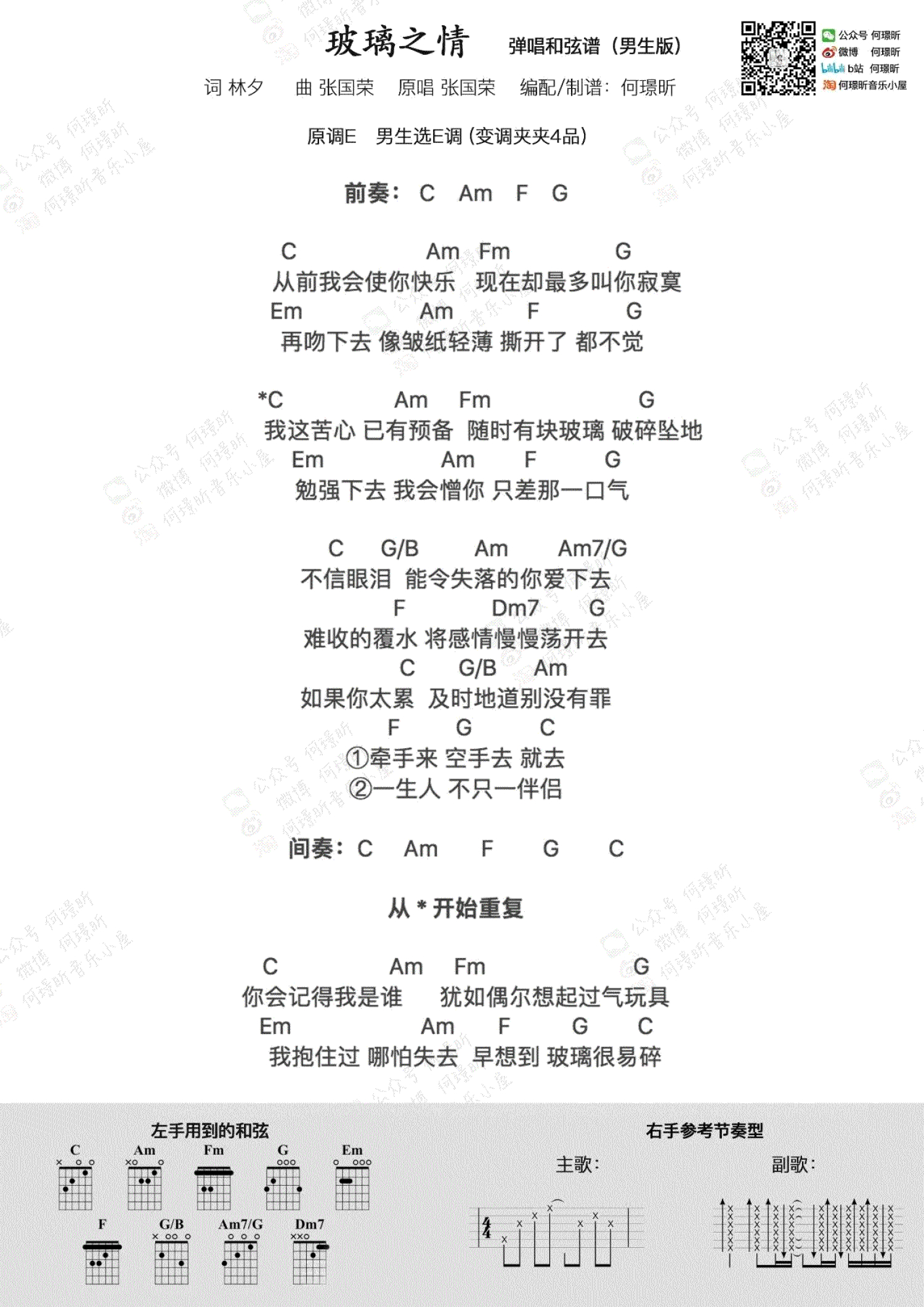 曲谱介绍: 《玻璃之情》吉他谱,张国荣的一首经典粤语歌曲,不信眼泪,能令失落的你爱下去,难收的覆水,将感情漫漫荡开去。玻璃之情吉他弹唱和弦谱,何Z昕编配分享,随谱附上弹唱演示视频打谱啦网整理上传。编配说明:老师做了两个版本的谱子~男生版和女生版。原版是E调,但考虑到可能大部分朋友不熟悉E调的和弦(也比较多横按)所以就给男生们准备了C调的指法,男生们可以变调夹从2-4品试过去,找到自己合适的音高,原调的话就是夹4品~女生版是G调指法,但G调对于我来说有点低,所以我夹了2品变调夹唱的是A调的音高~