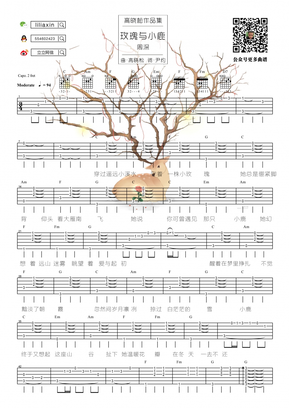 曲谱介绍: 周深《玫瑰与小鹿》吉他弹唱谱,共有2张高清图谱,免翻页排版设计。