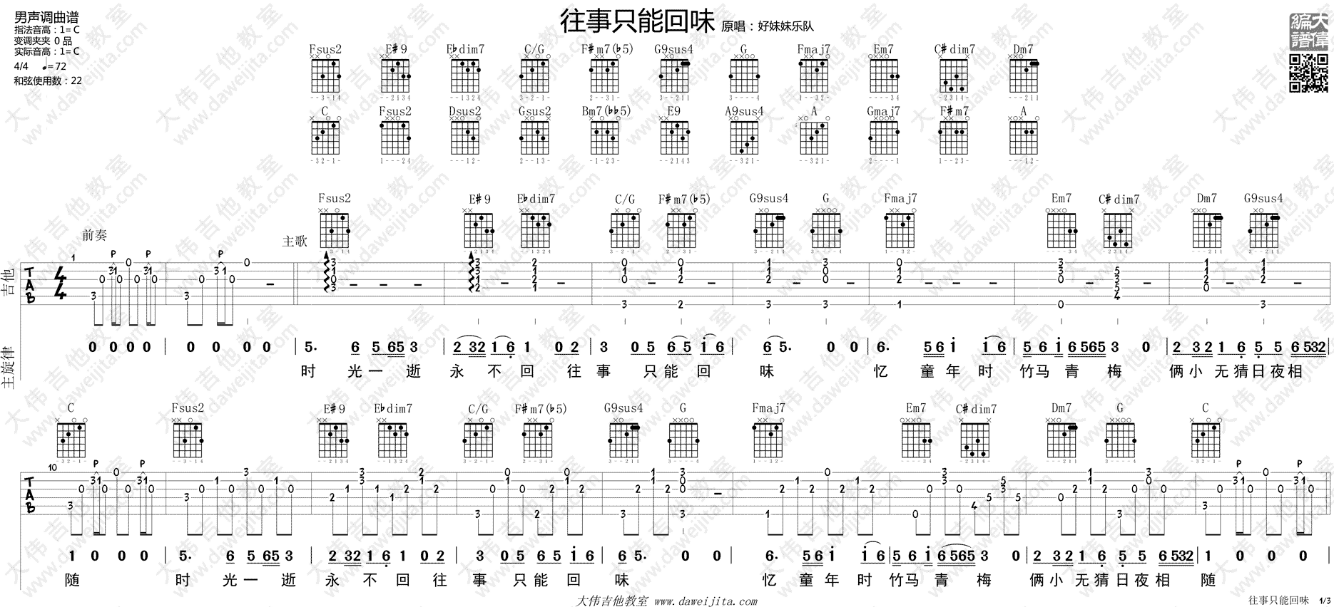 曲谱介绍: 好妹妹乐队《往事只能回味》吉他弹唱谱,采用C调指法编配,共有3张高清图谱。