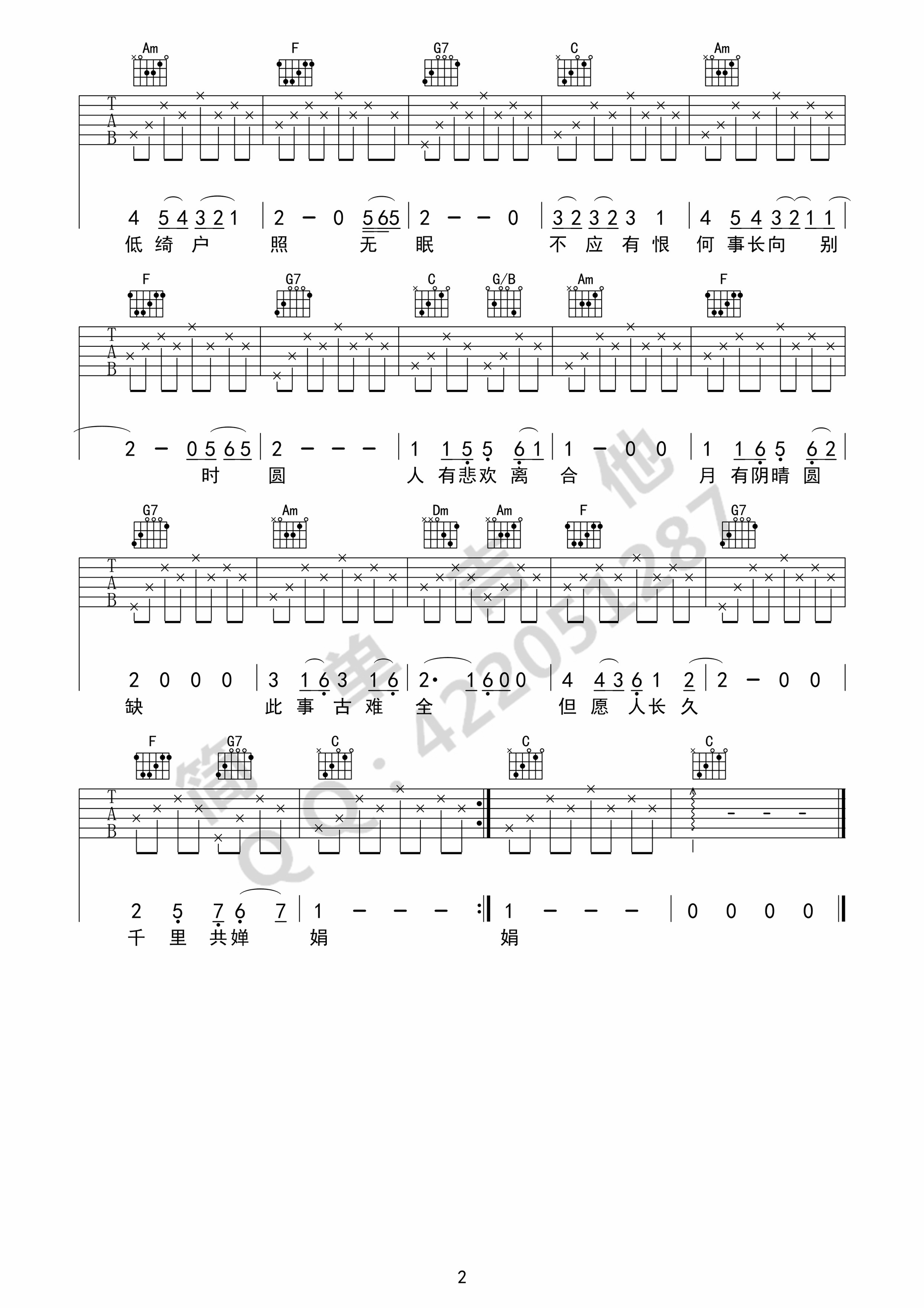 曲谱介绍: 王菲《但愿人长久》吉他弹唱谱,共有2张高清图谱,免翻页排版设计。