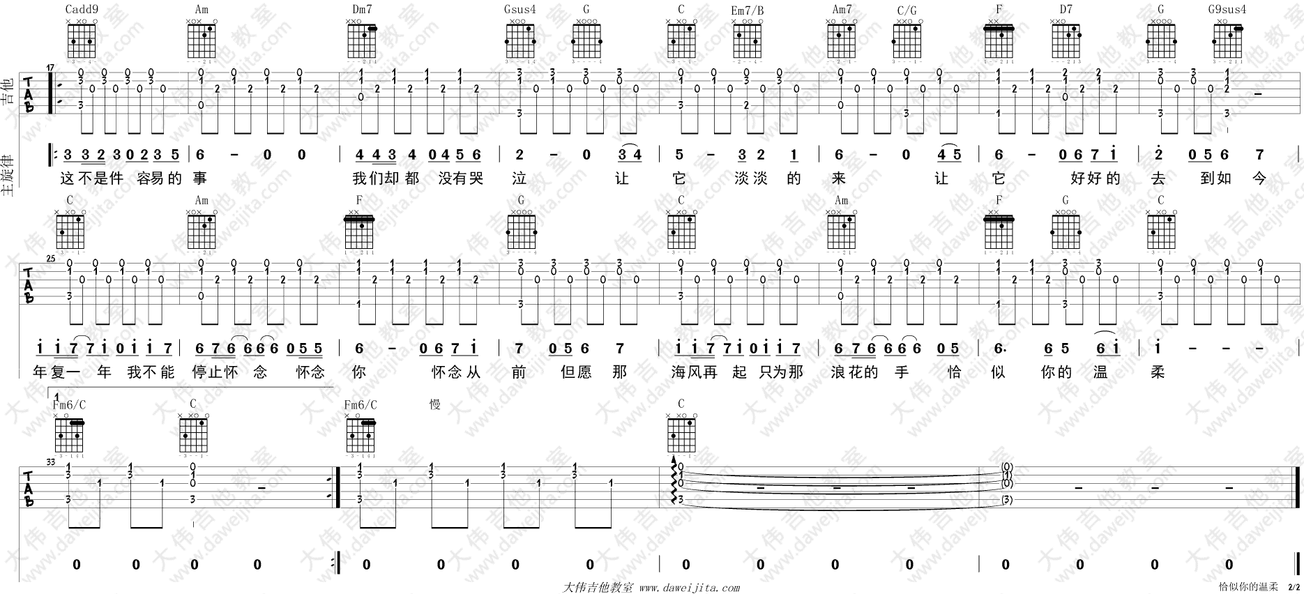 曲谱介绍: 蔡琴《恰似你的温柔》吉他弹唱谱,采用C调指法编配,共有2张高清图谱,免翻页排版设计。