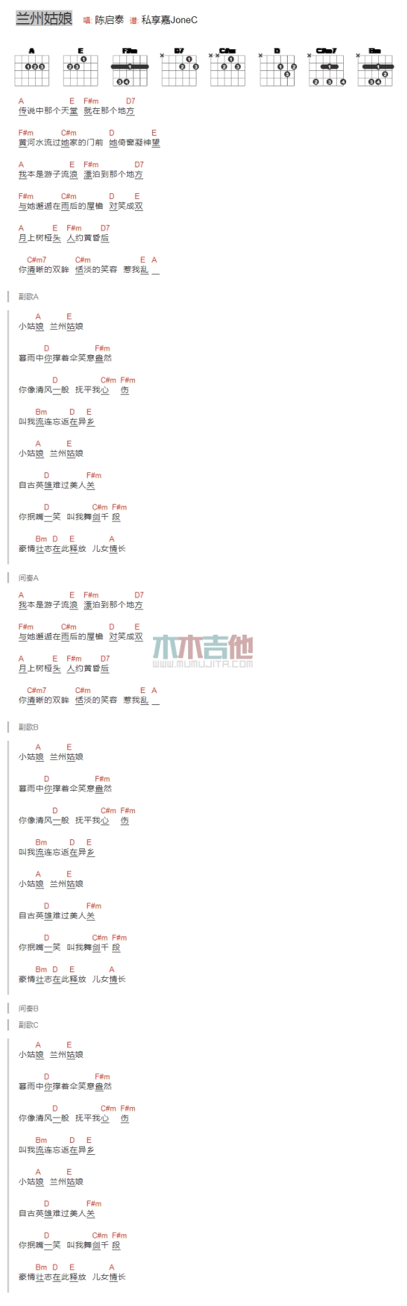 兰州姑娘吉他谱 - 陈启泰 - 吉他弹唱谱