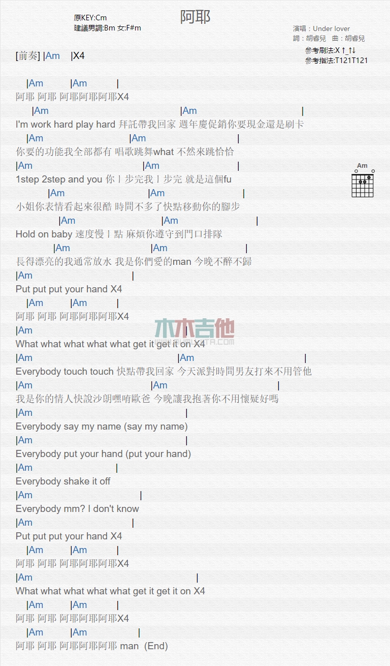 曲谱介绍: Under,Lover《阿耶》吉他弹唱谱,共有1张高清图谱,免翻页排版设计。