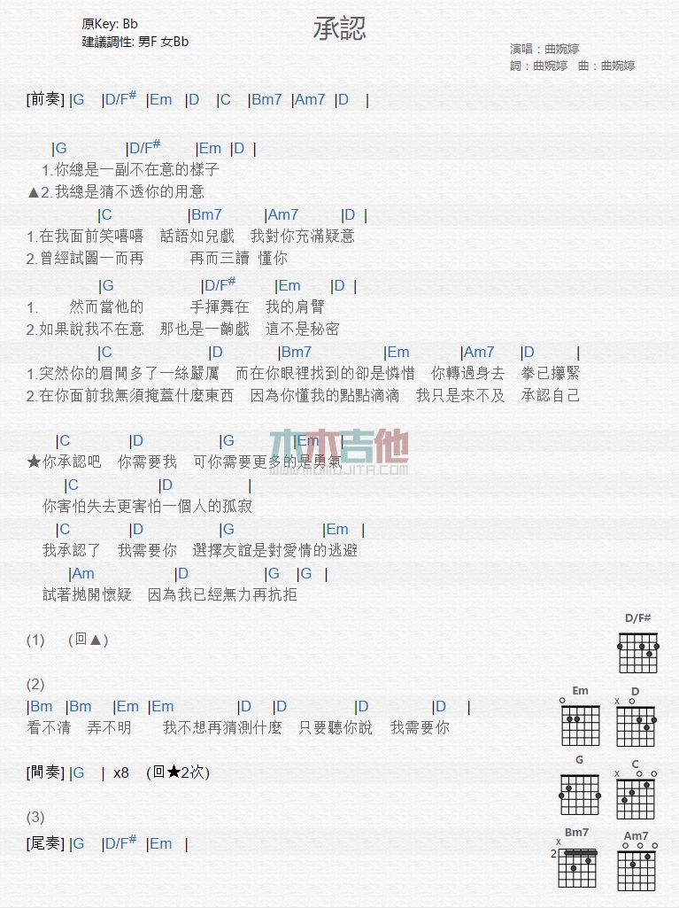 承认吉他谱 - 曲婉婷 - 吉他弹唱谱
