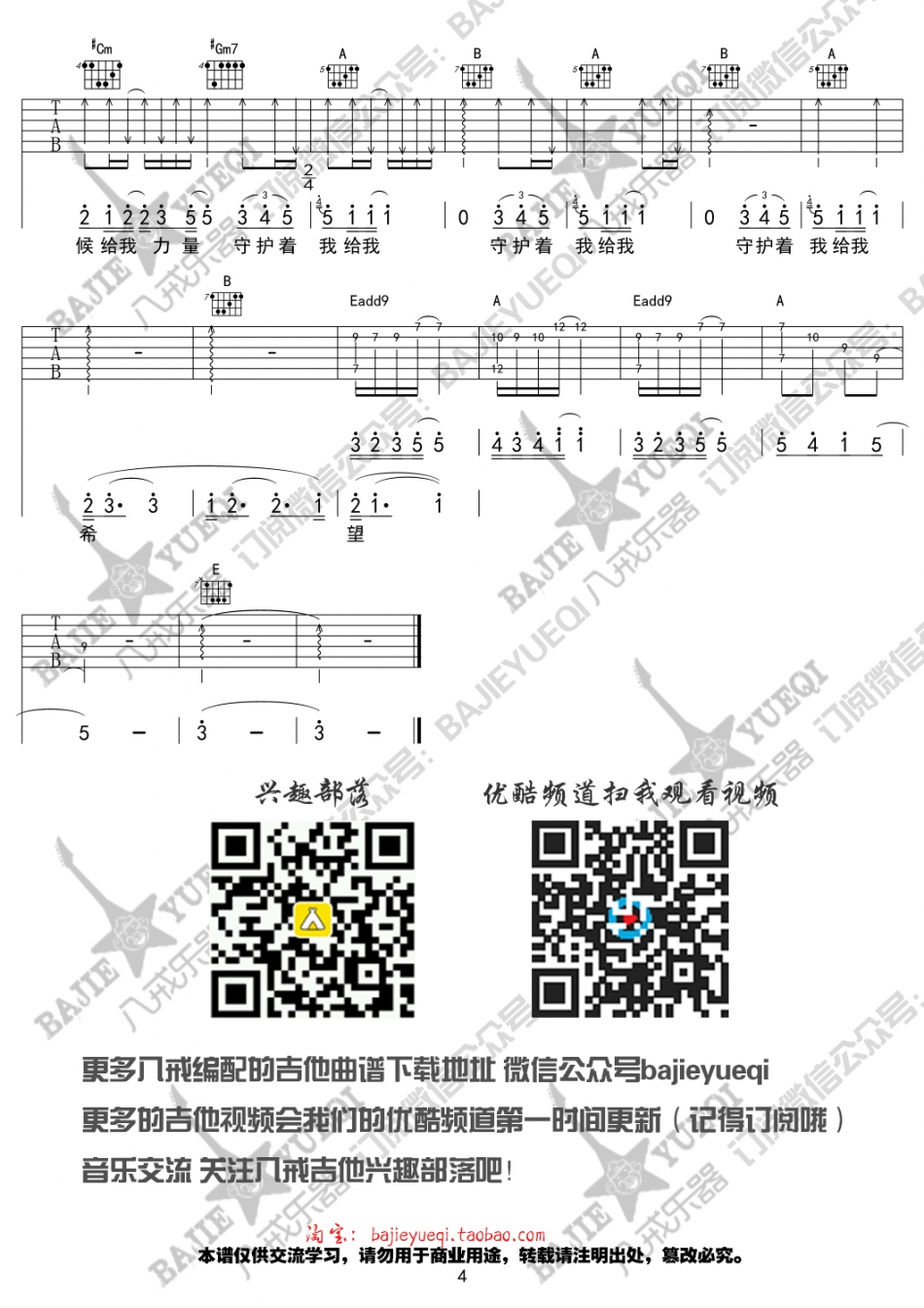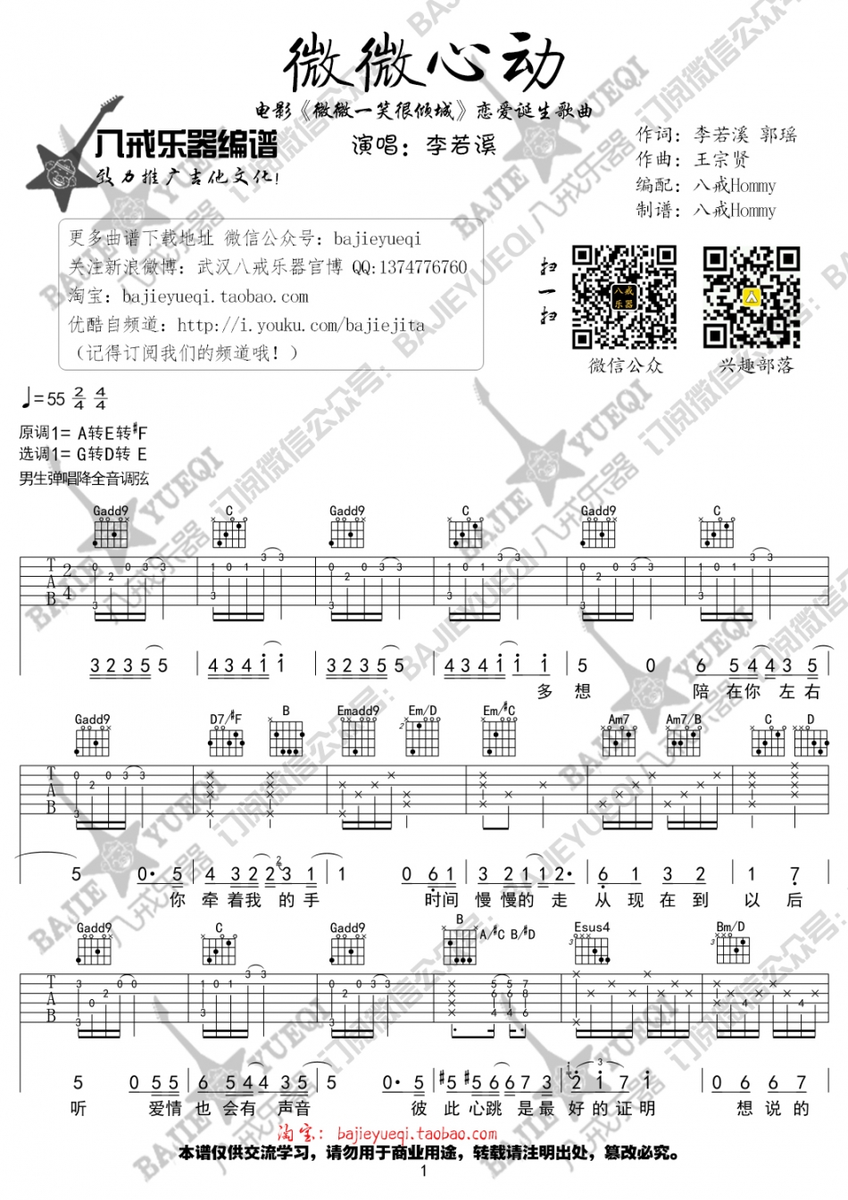 曲谱介绍: 李若溪《微微心动》吉他弹唱谱,共有4张高清图谱。