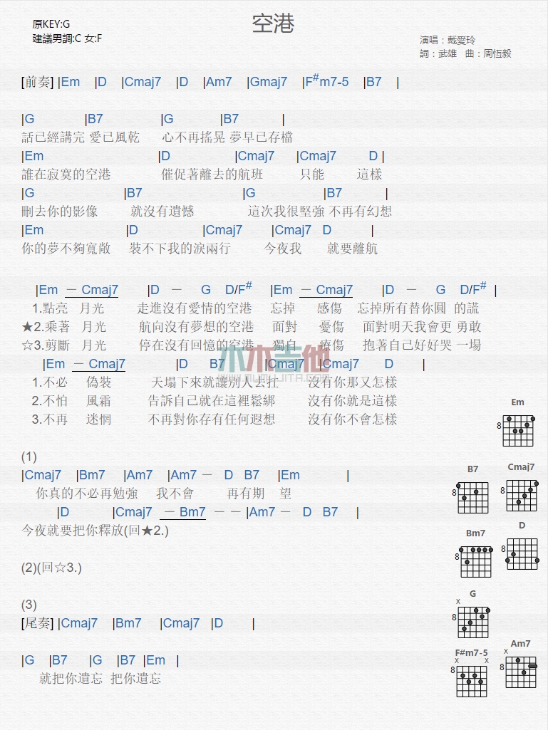 曲谱介绍: 戴爱玲《空港》吉他弹唱谱,共有1张高清图谱,免翻页排版设计。