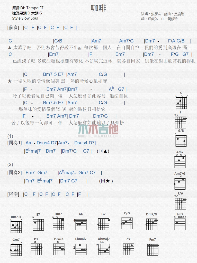咖啡吉他谱 - 张学友 - 吉他弹唱谱