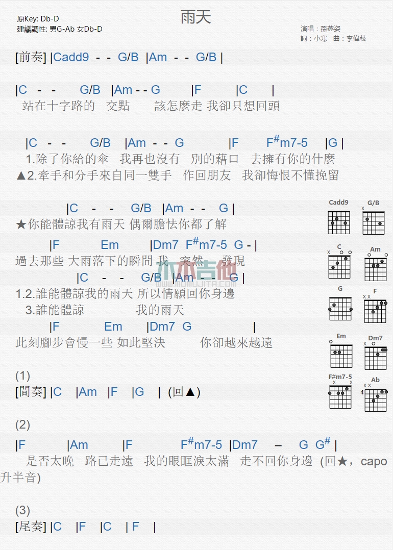 雨天吉他谱 - 孙燕姿 - 吉他弹唱谱
