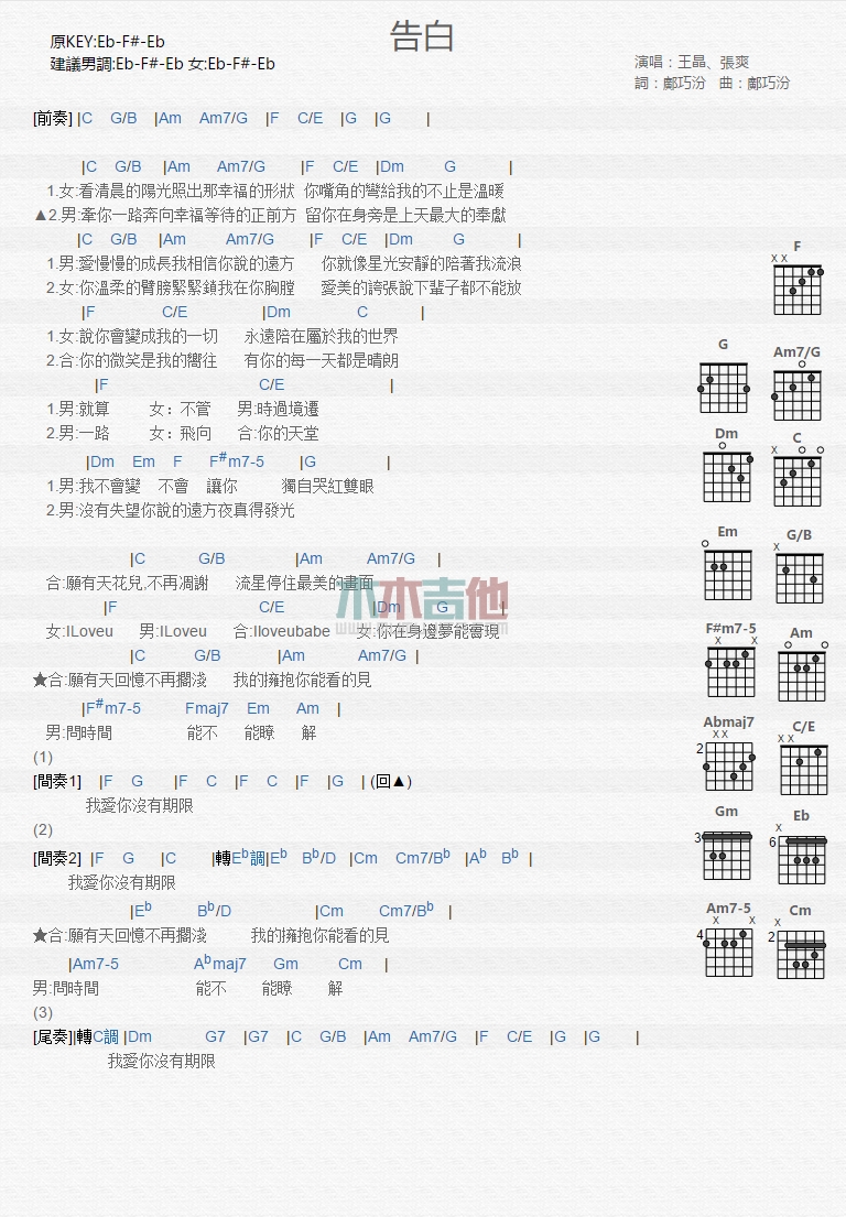 曲谱介绍: 王晶,张爽《告白》吉他弹唱谱,共有1张高清图谱,免翻页排版设计。