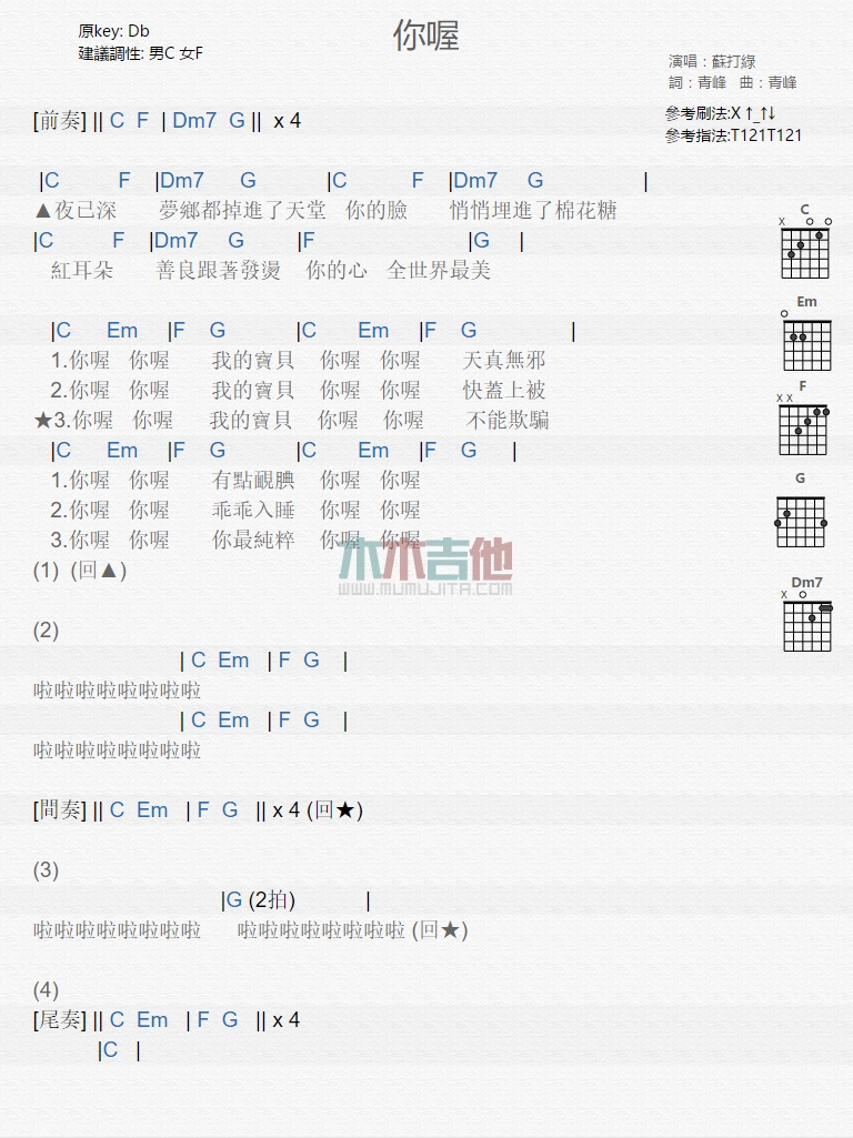 当前位置:琴谱网>吉他弹唱>你喔