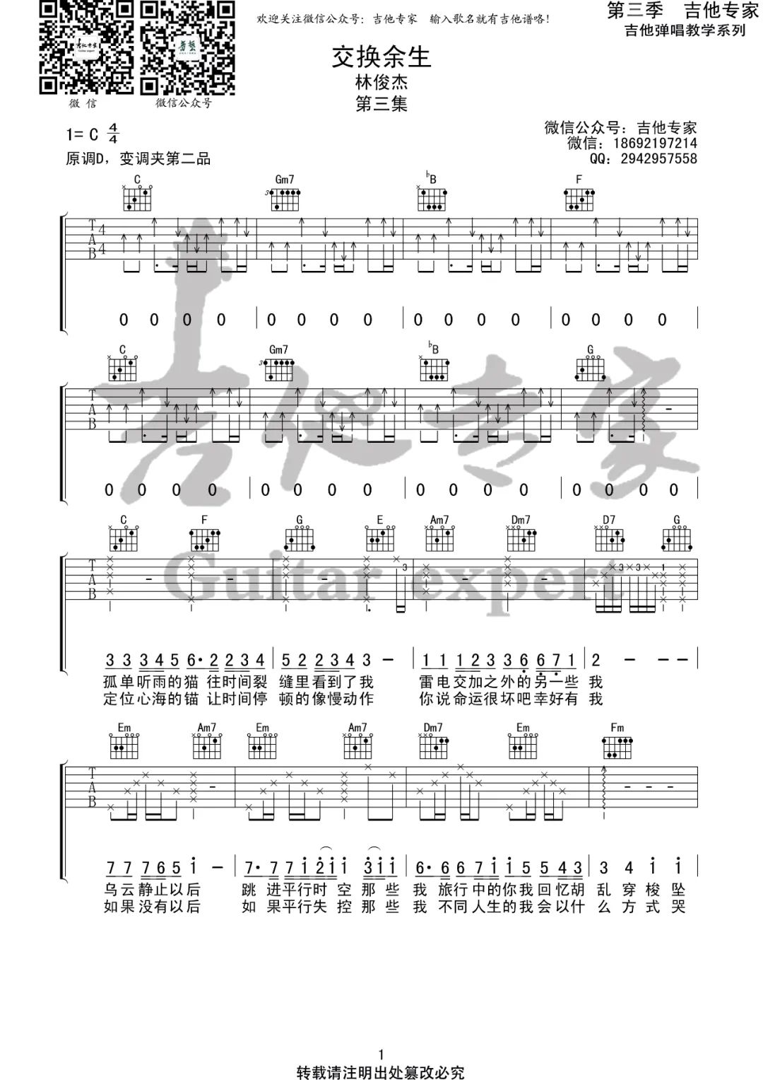 曲谱介绍: 吉他谱介绍:交换余生吉他谱,林俊杰演唱的一首歌曲,4/4拍的节奏,这首歌曲的原调为D调,这里曲谱采用了C调指法进行编配,演唱时夹变调夹2品可回到原调,也可根据个人实际嗓音情况选择。曲谱由琴谱网更新上传,共3张高清图片弹唱吉他谱例,来源于@吉他专家编配出品。这首歌的整体风格旋律婉转柔美,情绪起伏逐步递进。“交换余生,是我,非我,苦与乐,阴天之后总有续命的晴空。如果我们几经转折,结局一样不动,也才算无愧这分合”的歌词充满着宿命感的羁绊。