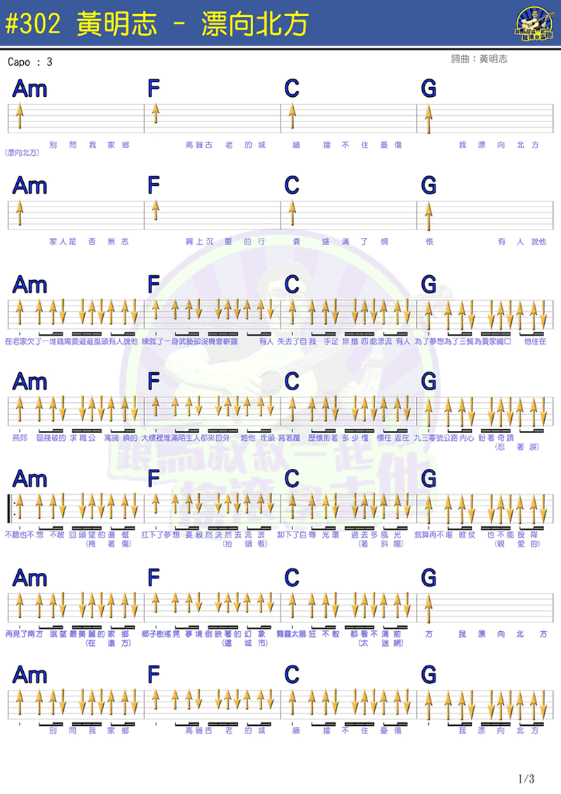 曲谱介绍: 吉他谱介绍:飘向北方吉他谱,黄明志演唱的一首歌曲,4/4拍的节奏,这首歌曲的原调为降E调,这里曲谱采用了C调指法进行编配,演唱时夹变调夹3品可回到原调,也可根据个人实际嗓音情况选择。曲谱由琴谱网更新上传,共3张高清图片弹唱吉他谱例,来源于@马叔叔编配出品。这首歌将说唱这一演唱形式与旋律配合得很自然,飘向北方的北漂迷失在都市阴暗的角落时,没有找到突破口的时候,不妨听听这首歌。