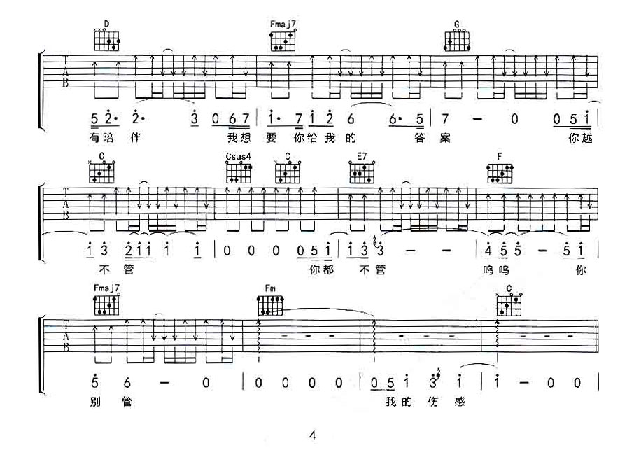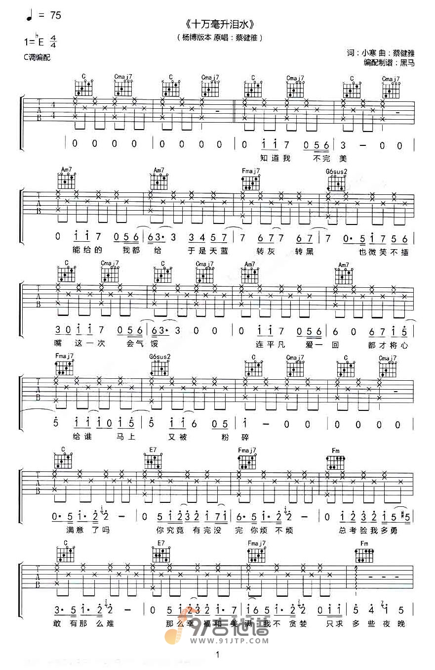 曲谱介绍: 曲谱简介:十万毫升泪水吉他谱,杨博演唱的一首歌曲,4/4拍的节奏,这首歌曲的原调为降E调,这里曲谱采用了C调指法进行编配,演唱时夹变调夹3品可回到原调,也可根据个人实际嗓音情况选择。曲谱由琴谱网更新上传,共4张高清图片弹唱吉他谱例,曲谱来源于网络转载,编配制谱者暂不详。这首歌原唱为蔡健雅,歌曲延续了之前蔡健雅的情歌曲风。简单平静的钢琴跟随,搭配低诉的弦乐贯穿全曲,突出了蔡健雅温暖而带有质感的声线。