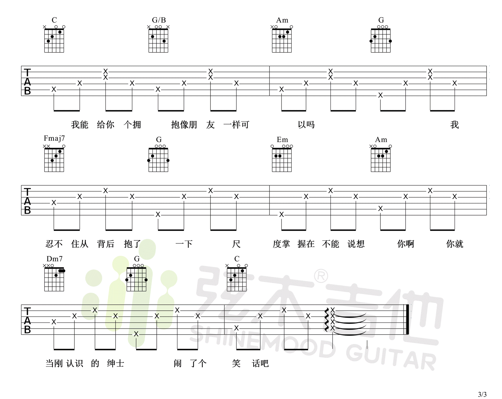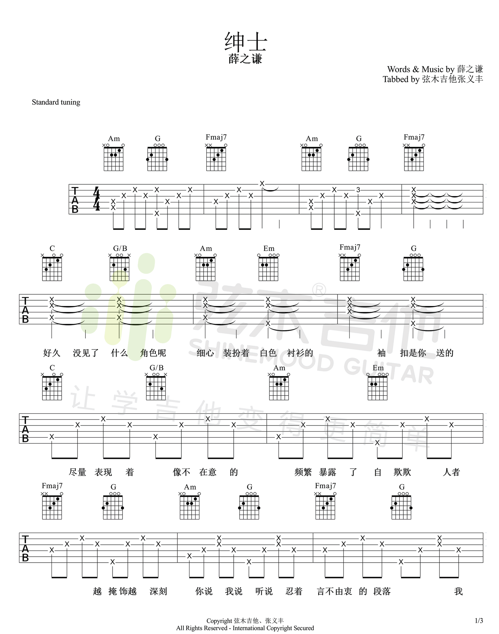 曲谱介绍: 吉他谱介绍:绅士吉他谱,薛之谦演唱的一首歌曲,4/4拍的节奏,这首歌曲的原调为#C调,这里曲谱采用了C调指法进行编配,演唱时夹变调夹1品可回到原调,也可根据个人实际嗓音情况选择。曲谱由琴谱网更新上传,共3张高清图片弹唱吉他谱例,来源于@弦木吉他编配出品。薛之谦的演唱深沉又深情,深层次地诠释了伤感,不仅唱腔更趋成熟,对细节的处理也更细腻。 绅士吉他弹唱教学