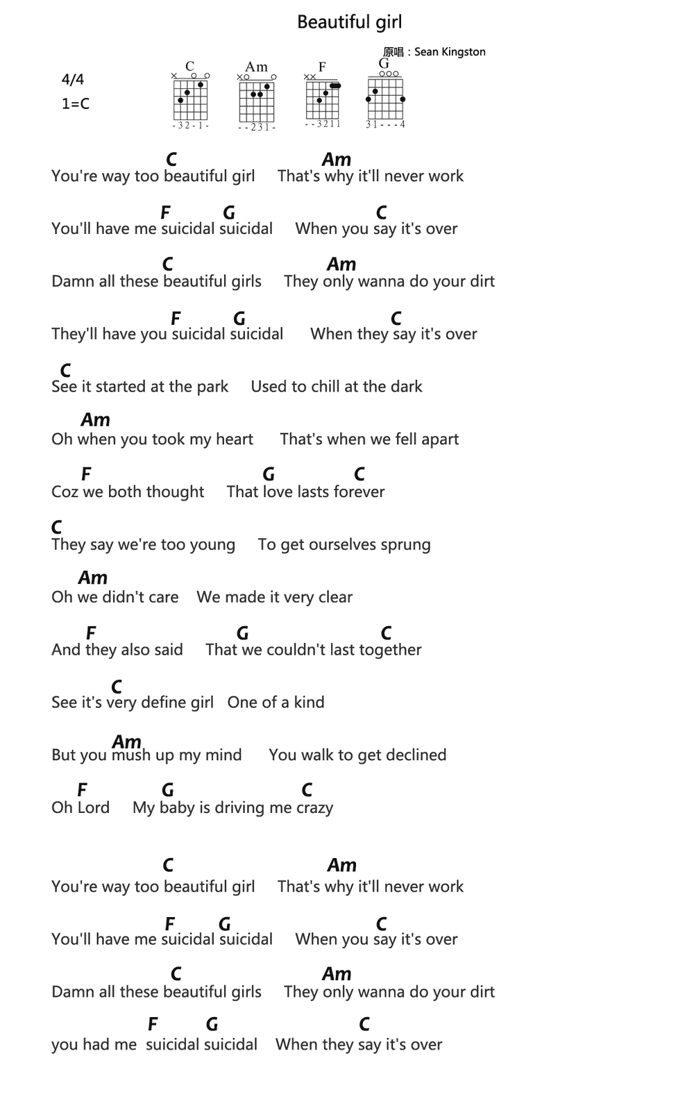 Beautiful Girls吉他谱 - Sean,Kingston - C调吉他弹唱谱