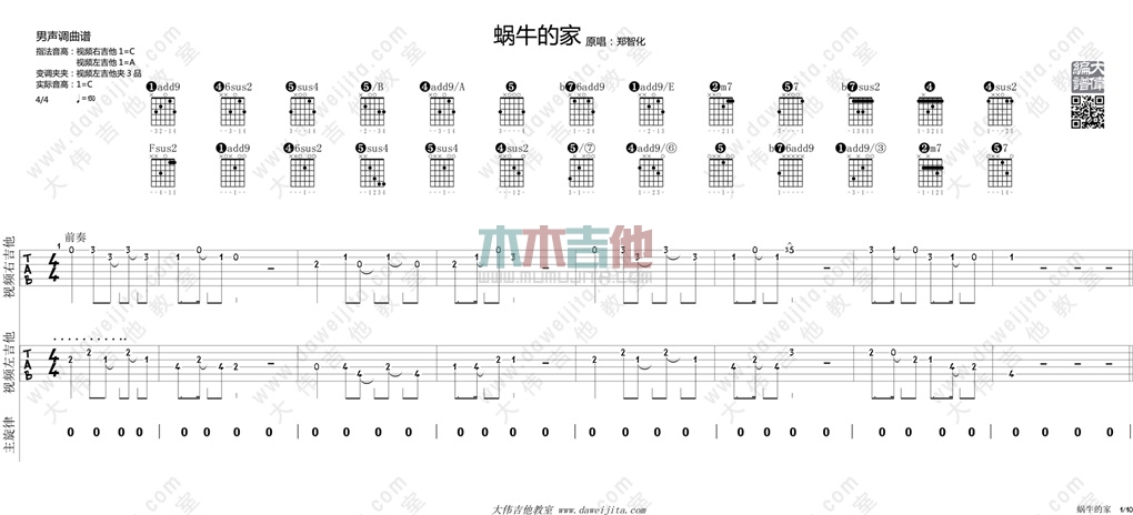 曲谱介绍: 郑智化《蜗牛的家》吉他弹唱谱,采用C调指法编配,共有10张高清图谱。