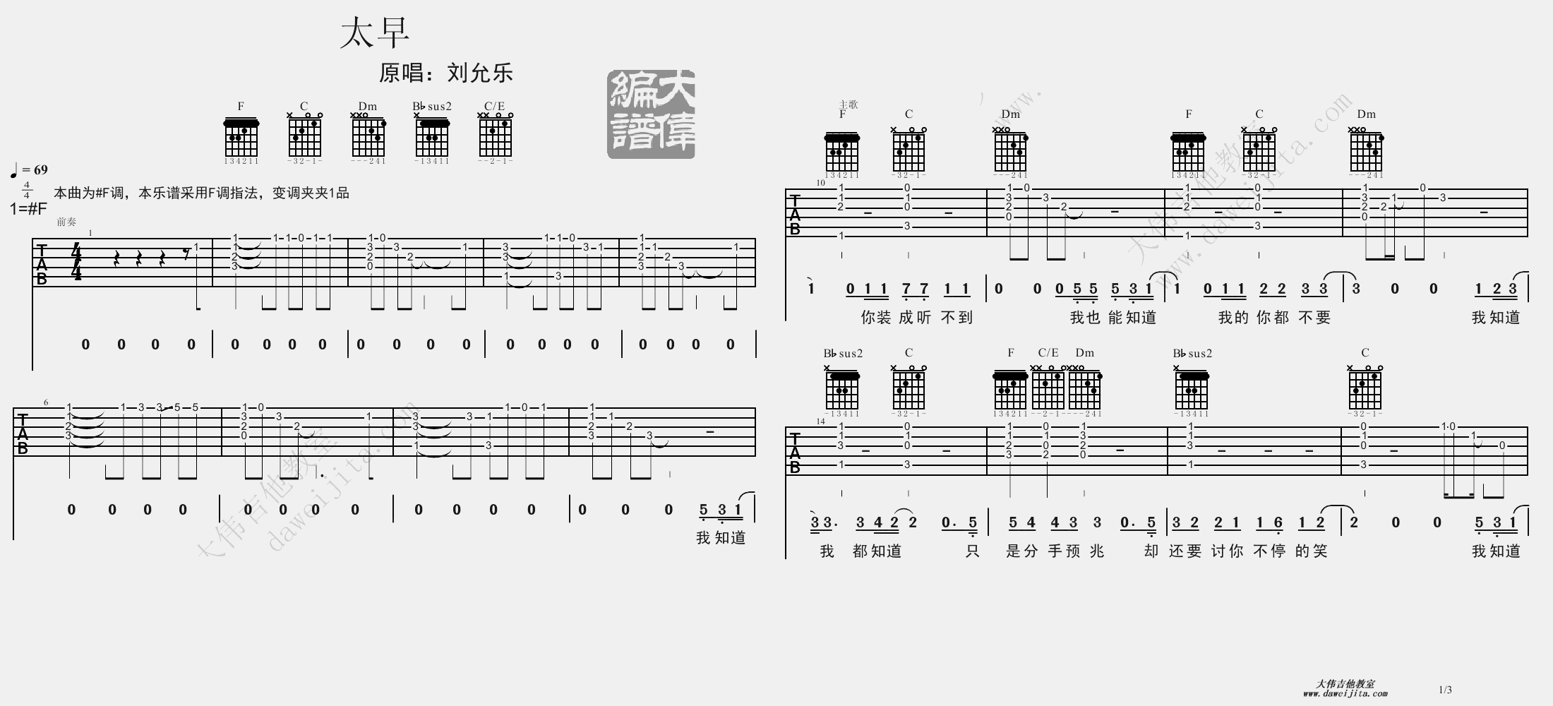 曲谱介绍: 刘允乐《太早》吉他弹唱谱,采用F调指法编配,共有3张高清图谱。