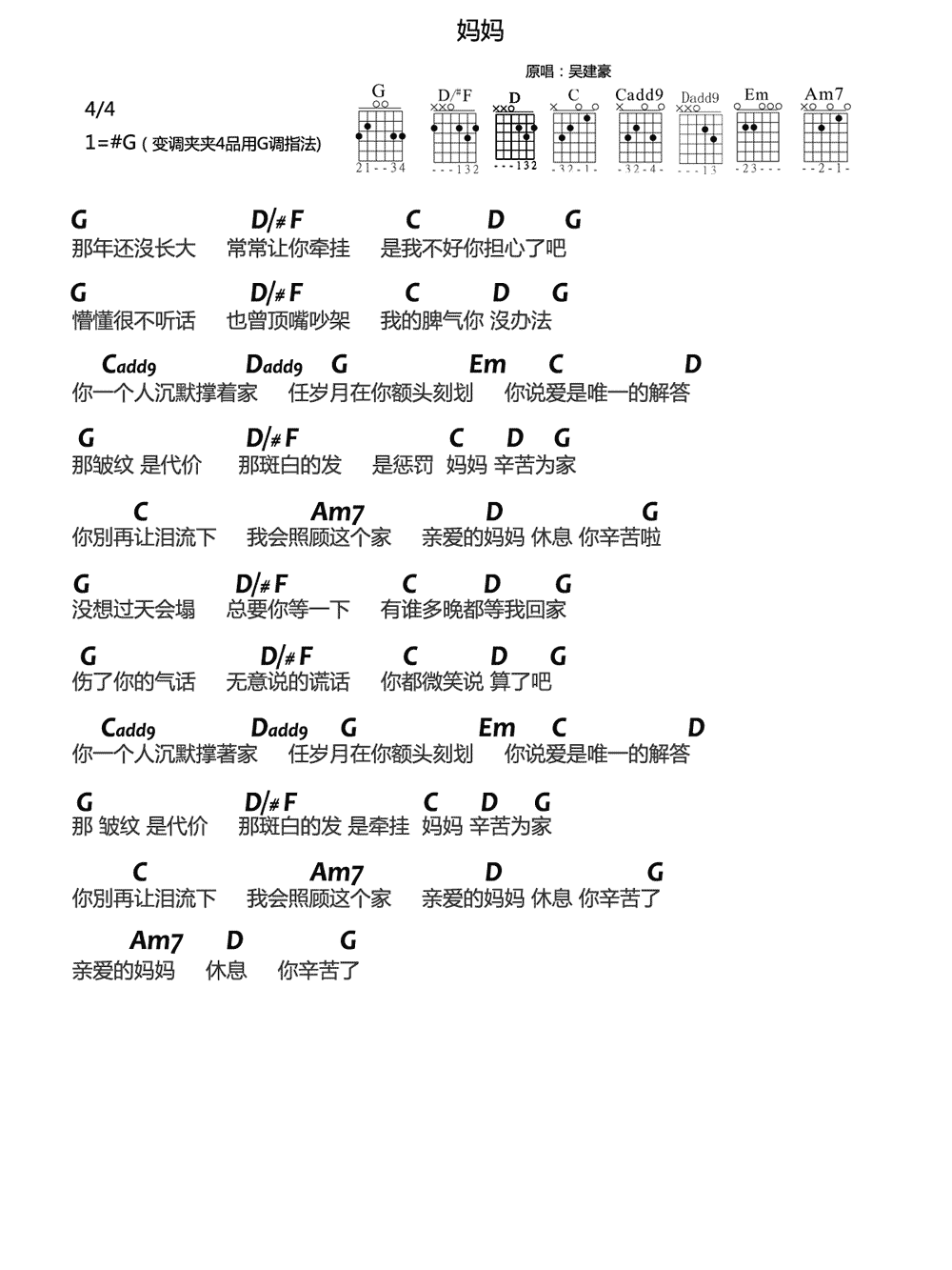 曲谱介绍: 吴建豪《妈妈》吉他弹唱谱,采用G调指法编配,共有1张高清图谱,免翻页排版设计。