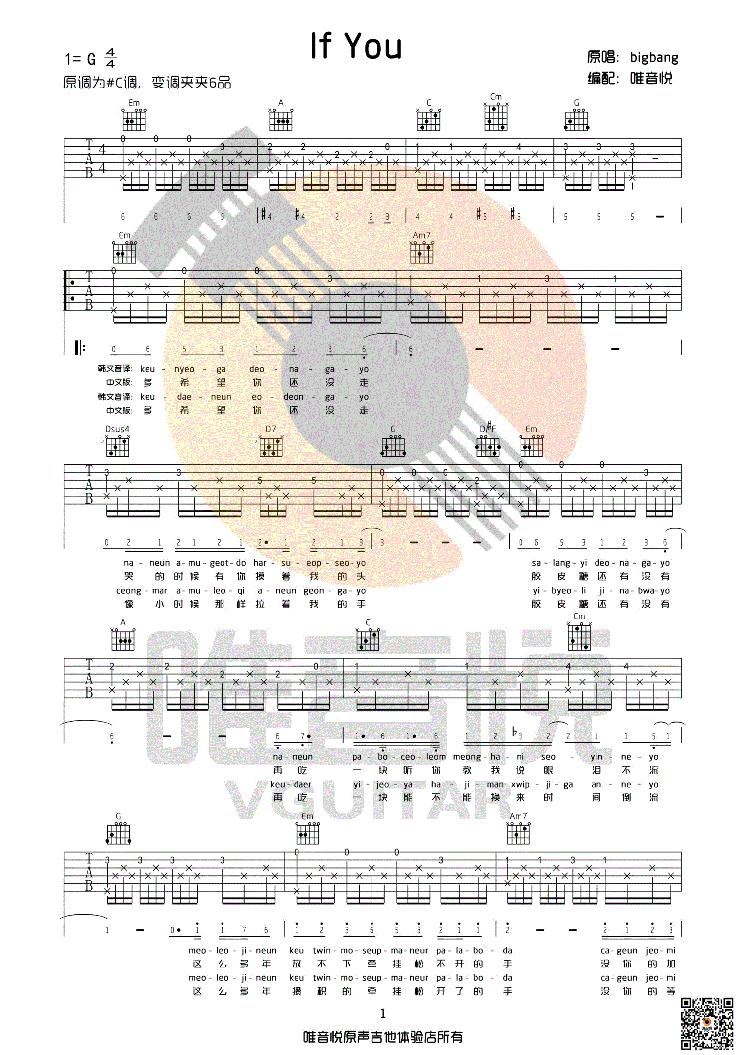 曲谱介绍: Bigbang《IFYOU》吉他弹唱谱,共有3张高清图谱。