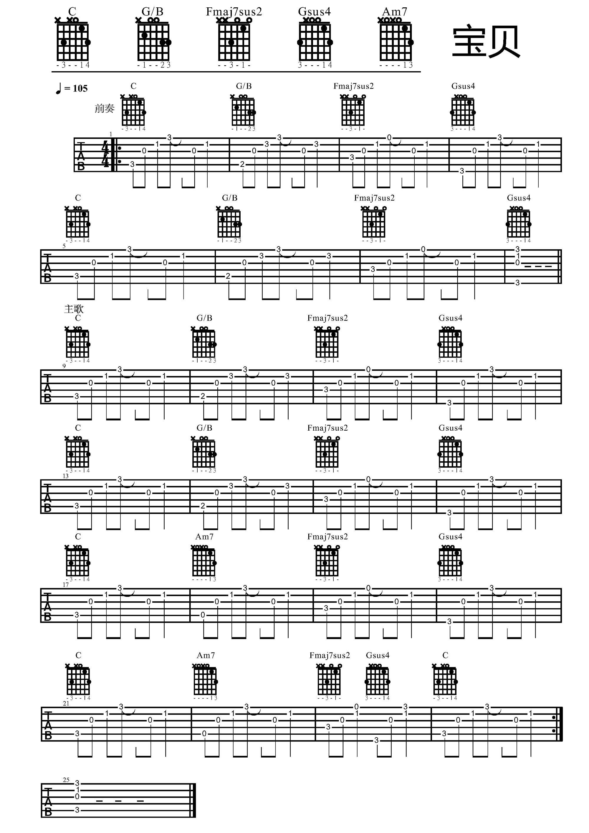 曲谱介绍: 张悬《宝贝》吉他弹唱谱,采用C调指法编配,共有1张高清图谱,免翻页排版设计。